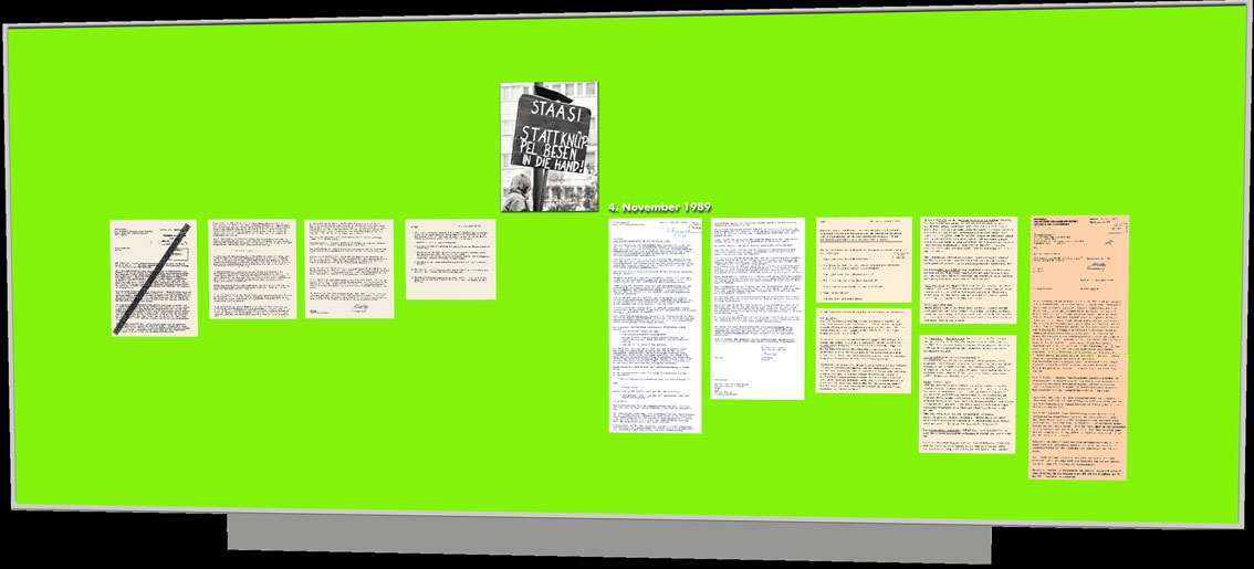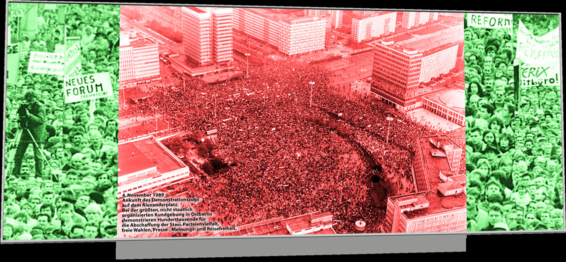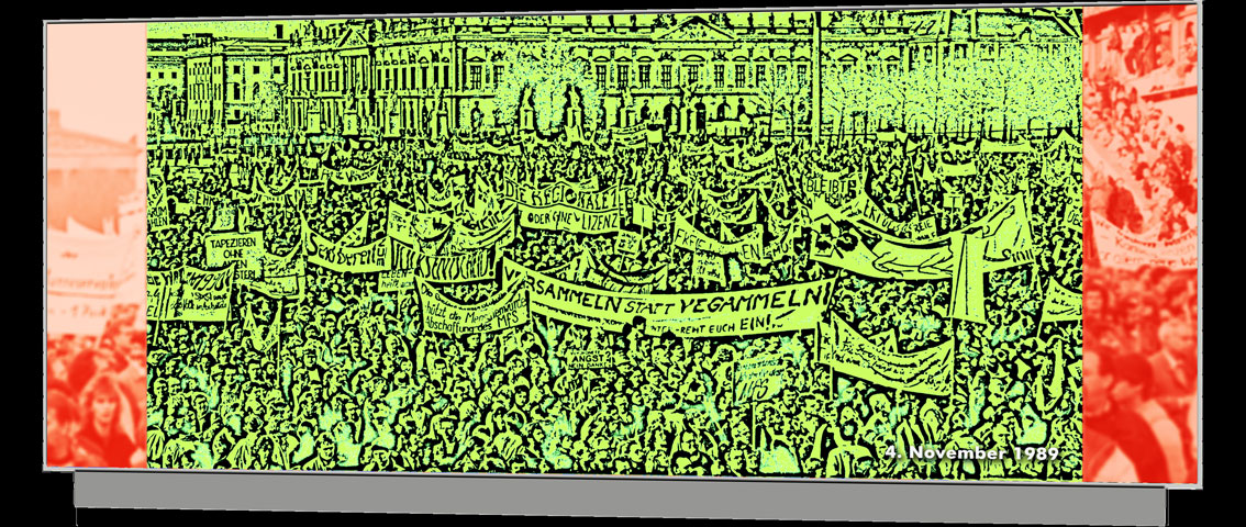 "Die größte Demonstration während der Herbstrevolution fand am 4. November 1989 in der Mitte Berlins statt, als sich dort etwa eine halbe Million Menschen versammelt haben. Die Idee dazu war von Mitgliedern des Neuen Forum in Berlin gekommen und von Theaterschaffenden aufgegriffen worden. Die Staatssicherheit war darüber sofort informiert worden. In der SED-Spitze und im Sicherheitsapparat begann ein Tauziehen um die Frage, ob man die Demonstration verhindern sollte. Während die zuständige Ostberliner Volkspolizei gegen eine Genehmigung war, hielten die Berliner Bezirksverwaltung für Staatssicherheit und die SED ein Verbot für nicht durchsetzbar. Schließlich beschloss die SED-Führung, dass die Demonstration genehmigt werden sollte. Aufgabe der Sicherheitsorgane war nun, zu verhindern, dass etwas aus dem Ruder läuft. Tatsächlich war diese überaus friedliche und bunte Demonstration eine entscheidende Etappe der Herbstrevolution: Mit ihr sind hunderttausende bisher unauffällige Bürgerinnen und Bürger auf die Seite der Opposition gewechselt." (http://www.bstu.bund.de)