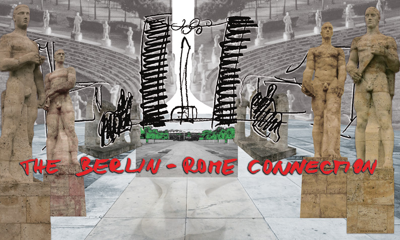 The Berlin - Rome Connection draws a line from the Foro Italico in Rome to the Olympic Stadium in Berlin: Both sports facilities were propaganda tools for two major criminals in the 20th century, Mussolini and Hitler, small-sized men, who used sports, architecture and sculpture to manipulate and emotionalize the crowds; both built themselves a stage for propaganda as part of the capitals' urban structures to demonstrate their power and glory. Muscular bodies decorate the sites; the accompanying statues are over-sized, praising Machismo and male dominance.