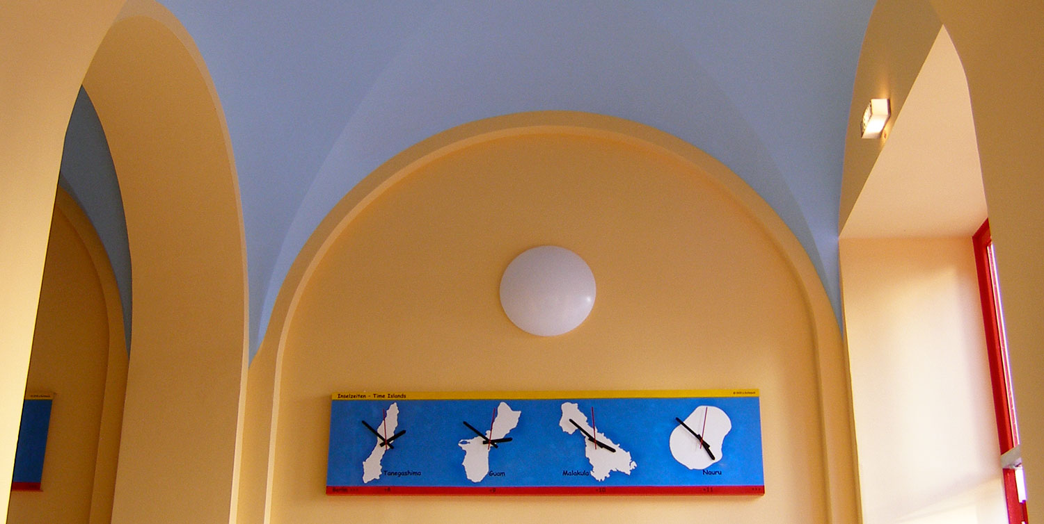 Im Eingangsbereich steht eine Reihe von 24 Uhren, die nach den 24 Zeitzonen aufeinander folgend gestellt sind, für den Zusammenhang von Integration und globaler Interaktion an der Schule. Die 24 Zeitzonen sind nicht wie üblich mit den Namen bekannter Städte wie Paris, Moskau, New York versehen, sondern mit den Namen und Umrissen von Inseln, die sich in der jeweiligen Zeitzone befinden. Die Inseln sind teils bekannt, oft jedoch unbekannt. Dieses Element der Verfremdung wird noch dadurch verstärkt, dass neben den Namen noch Tafeln mit den Umrissen der Inseln angebracht sind. Die Umrisse jedoch sind maßstäblich alle auf die gleiche Größe gebracht .Die Schülerinnen und Schüler, die aus verschiedenen Ländern der Welt stammen, können sich so mit einem Element der Installation identifizieren und verstehen sich als Teil des Weltganzen.